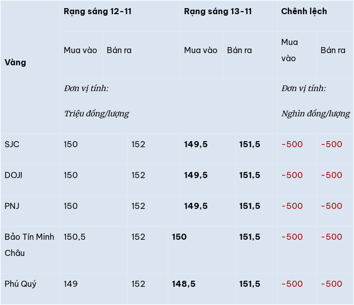 Giá vàng hôm nay (13-11): Các thương hiệu vàng trong nước hôm nay đồng loạt giảm giá vàng miếng, vàng nhẫn nửa triệu đồng mỗi lượng. Trong khi đó, giá vàng thế giới vượt ...